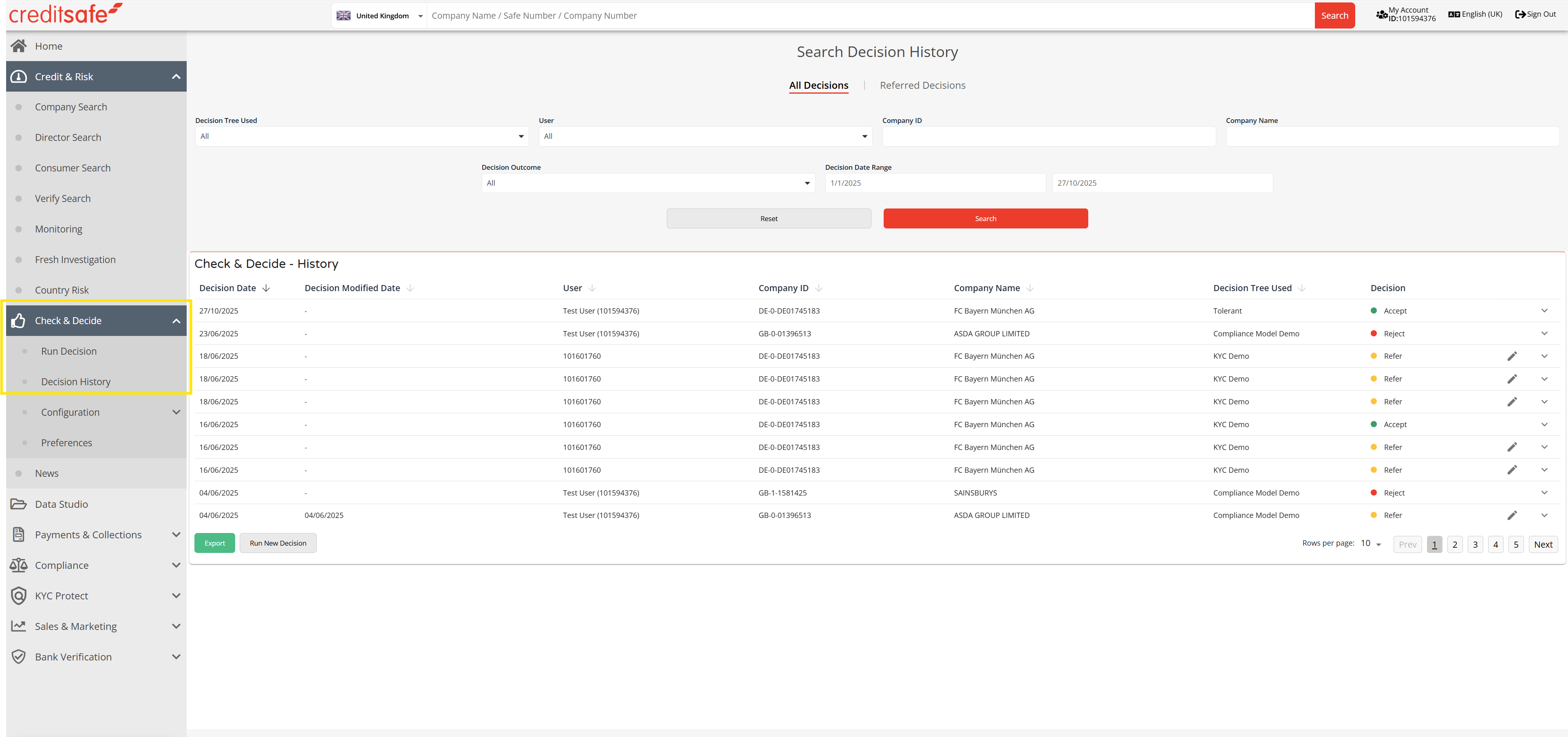 You can choose to save the details of the Outcome as a pdf. Selecting the ‘Run New Decision’ button will navigate you to the Check & Decide search page to look for another company and run a new decision.